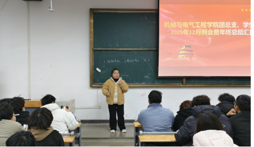 2025年12月24日中午,为了系统复盘年度团学工作、明确后续工作方向,机械与电气工程学院团总支、学生会于教1-108顺利召开了12月例会暨年终工作总结。本次会议由院团总支书记李兰芳老师主持,学院党总支书记张丽芳参会。